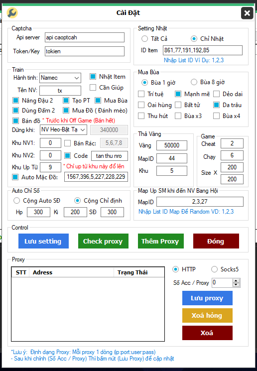 - Proxy hỗ trợ fake xoay vòng, Fake theo số tab muốn, Check Live Proxy trước khi Login, Tự động bỏ qua tìm Proxy khác nếu Proxy đó hỏng.